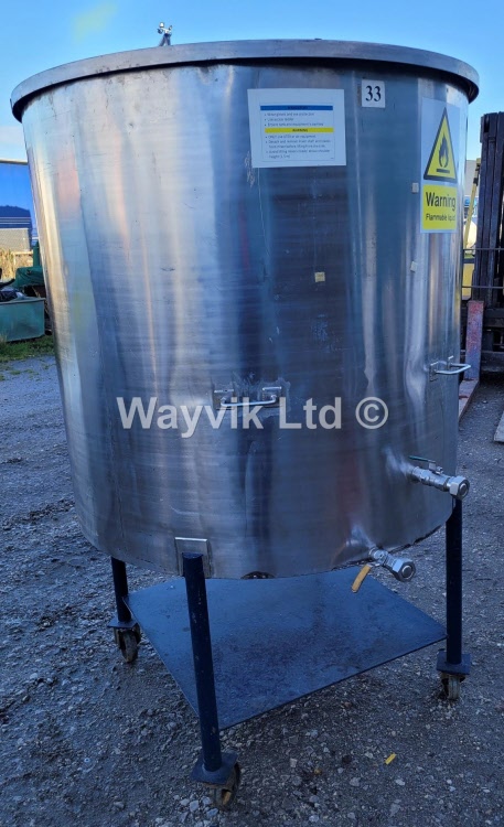 1210mm dia x 1180mm deep with loose top cover and flat sloping base. 1" BSP outlets to mid and lower side. Push / pull handles on side. Ex-food use.