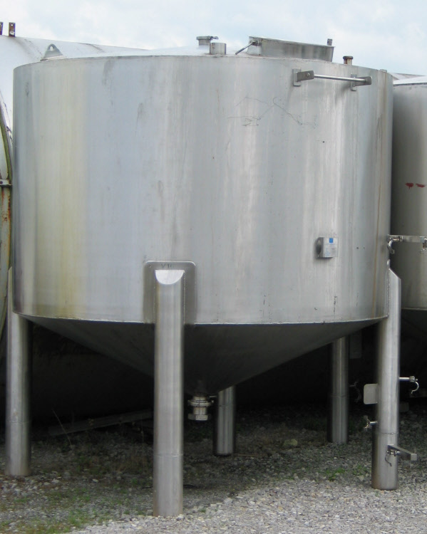 1800mm dia x 2050mm deep on straight. Shallow cone top and base. Four legs. Ex-food product use.