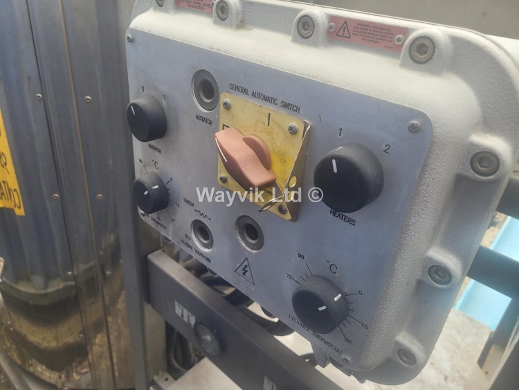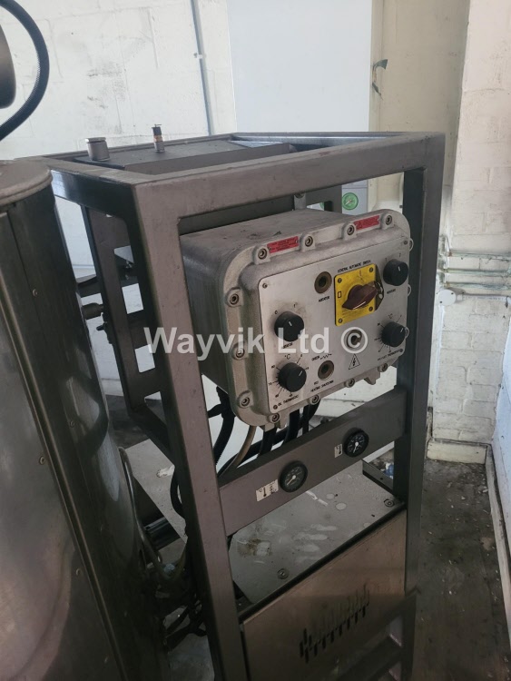 700mm dia x 855mm DEEP mean depth. Segment hinged top cover. Flat sloping base. Low shear agitator driven by 0.75kW 400/3/50 1410-rpm motor through reduction gearbox. ATEX rated Ex II 2GD Ex e IIC T3. Fully insulated vessel with hot oil temperature control jacket. Twin electric heater pokers and head tank. FORMECO type F-CCFE3 400V/3/50 300W ATEX rated EX II2G Exd IIB T4 adjustable thermostatic temperature controller.
