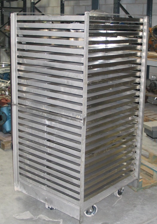 Trolley dimensions 1725mm high x 895mm long x 830mm wide. 50 tray capacity. 810mm long x 390mm wide x 30mm deep trays.